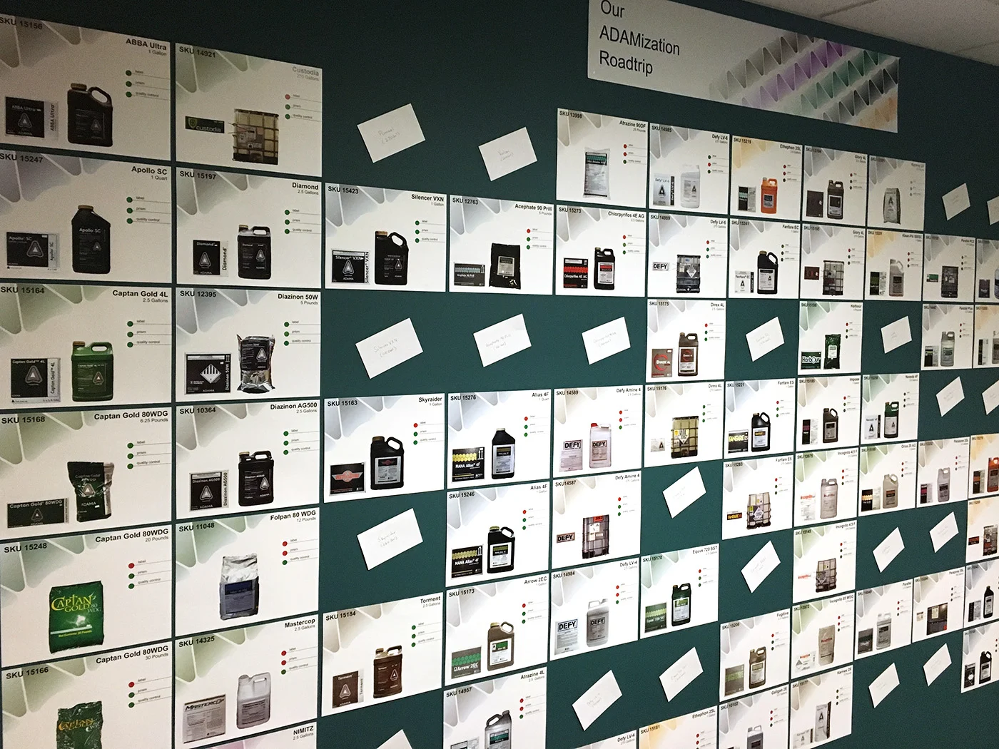 Every product is showcased by SKU level on a template, amounting to 96 SKU’s. The installation is comprised of images and a checklist of criteria mounted on a template. The visualization is evolving and temporary on a wall in ADAMA's Raleigh office. Each panel has the ability to be taken down once it meets the new brand standards. The ultimate goal is for each product to achieve those standards.