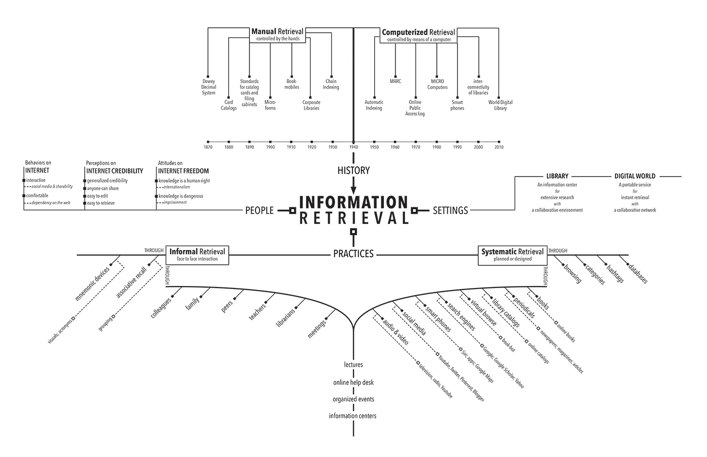 I was given the topic, "Information Retrieval" and tasked with researching and mapping out the topic. After an expansive literature review was completed, I diagramed my gathered information in a concept map seen here. To the left, the process of the mapping is displayed.